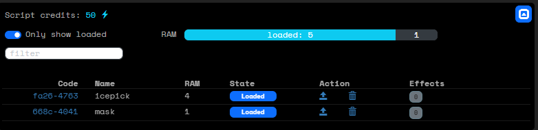 While in a hacking run, you can view the scripts you have loaded. Click the script icon in the top right corner of the map, to expand the script panel.